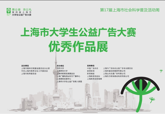 2017年第四屆上海市大學生公益廣告大賽收到全市2000余名大學生設計的公益廣告作品,本次展覽將展出其中優秀作品60幅,歡迎廣大師生前往參觀。