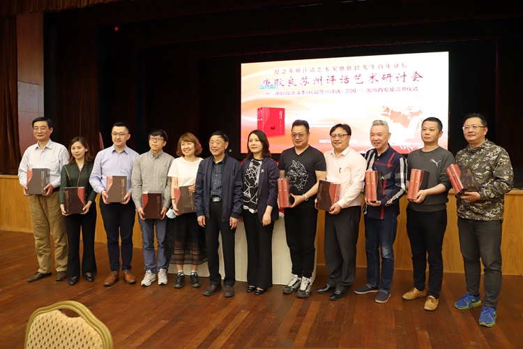 隨后的贈書儀式上,上海師范大學教授、唐耿良先生的長子唐力行介紹了“唐《三國》”整理出版的相關情況,并向本次會議的主辦、協辦單位贈書。唐力行教授介紹到,正是蘇州評彈這一傳統藝術構建起了他們父子間對藝術研究的傳承紐帶,幫助他開創了一片全新的學術天地,治學的同時,更是以此表達他對父親及其一生鐘愛和奉獻的蘇州評彈藝術的深摯懷念與別樣禮敬。