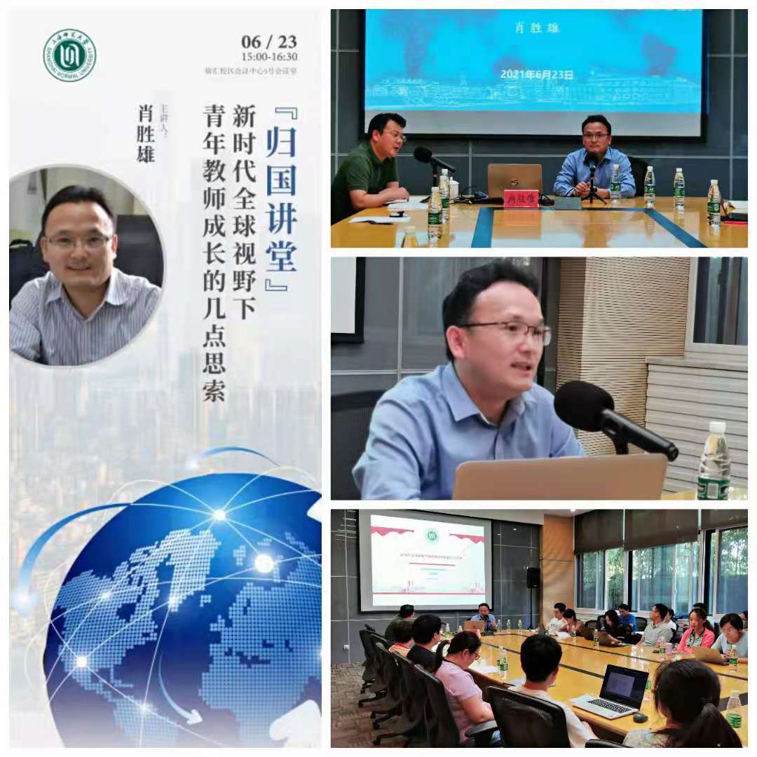 6月23日下午,在徐匯校區會議中心5號會議室,由人事處組織的“歸國講堂”第二場講座開講。我校化學與材料科學學院副院長肖勝雄教授為青年教師作了題為《新時代全球視野下青年教師成長的幾點思索》的精彩報告,30余名青年教師聆聽了報告。