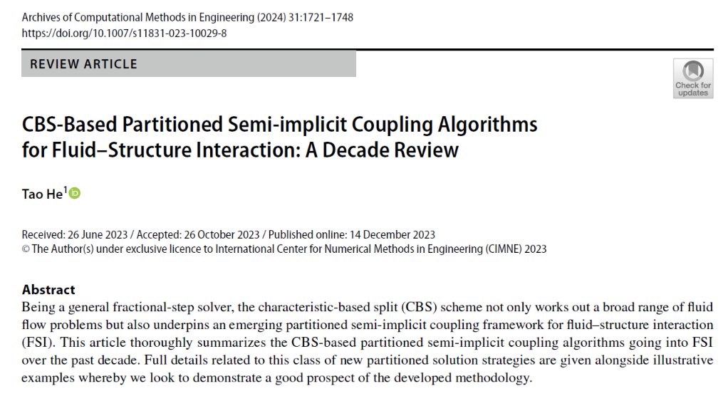 近日,建工學院教師何濤在國際SCI期刊《Archives of Computational Methods in Engineering》(IF = 9.7)發表題為“CBS Based Partitioned Semi implicit Coupling Algorithms for Fluid-Structure Interaction: A Decade Review”的綜述論文。文章詳盡回顧了一種新穎的流固耦合數值算法—基于特征線分裂的分區半隱式耦合算法—最近十年的理論發展與應用。論文由期刊主編、國際計算力學學會前主席Eugenio O?ate教授直接錄用。何濤是本文的獨立作者,上海師范大學為唯一署名單位。