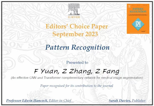 該論文發表于2023年4月,同年9月被授予編輯精選論文(Editors’ Choice Paper)榮譽。截至發稿日,該論文SCI他引達110次。該論文是袁教授指導博士生張正驍取得的最新研究成果,提出將Transformer的長距離依賴關系建模能力與CNN的局部上下文特征提取能力相結合,取得優秀的實驗結果。《Pattern Recognition》期刊為中科院計算機科學大類一區,也是人工智能小類一區和電子與電氣小類一區,近三年平均影響因子為8。在斯坦福大學發布的全球前2%頂尖科學家榜單中,袁教授已經連續四年(2020年至2023年)入選“年度科學影響力榜單”,并連續三年(2021年至2023年)入選“終身科學影響力榜單”。