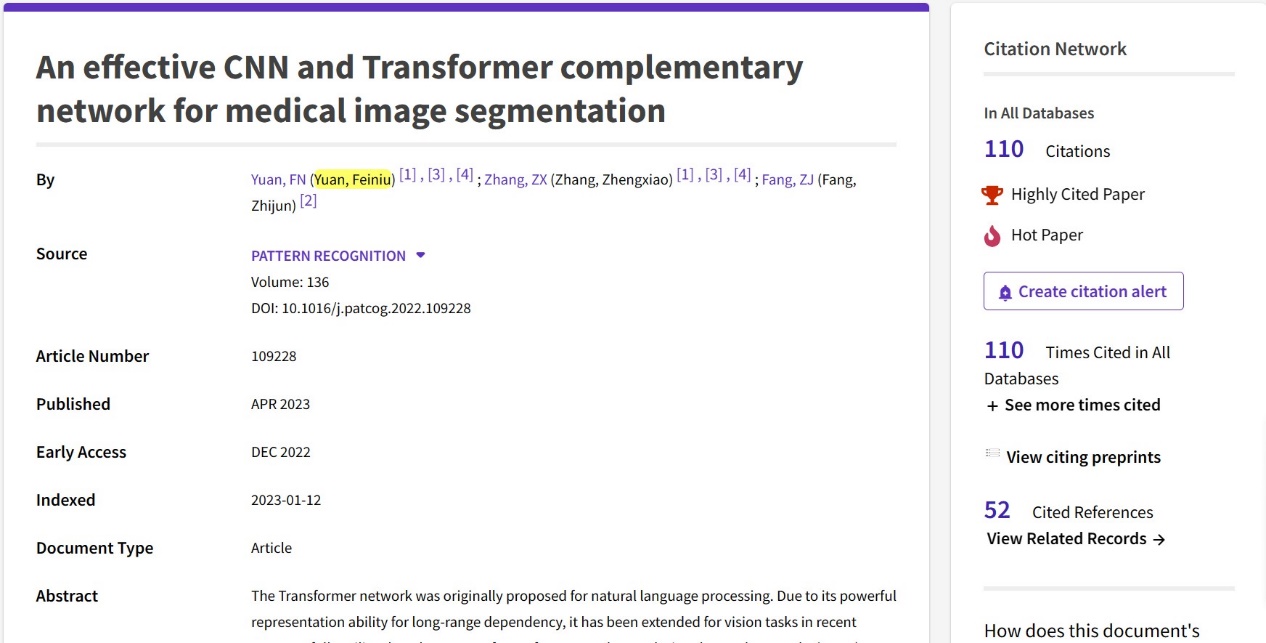 在人工智能方面,信機學院袁非牛教授在中科院一區期刊《Pattern Recognition》上發表的論文“An effective CNN and Transformer complementary network for medical image segmentation”,被評為高被引論文(Highly Cited Paper),即同一年在工學領域的發表論文中,被引用次數位列世界前1%。同時,該論文被評為熱點論文(Hot Paper),即在2024年1月至2月期間,其在工學領域被引用次數位居世界前0.1%。