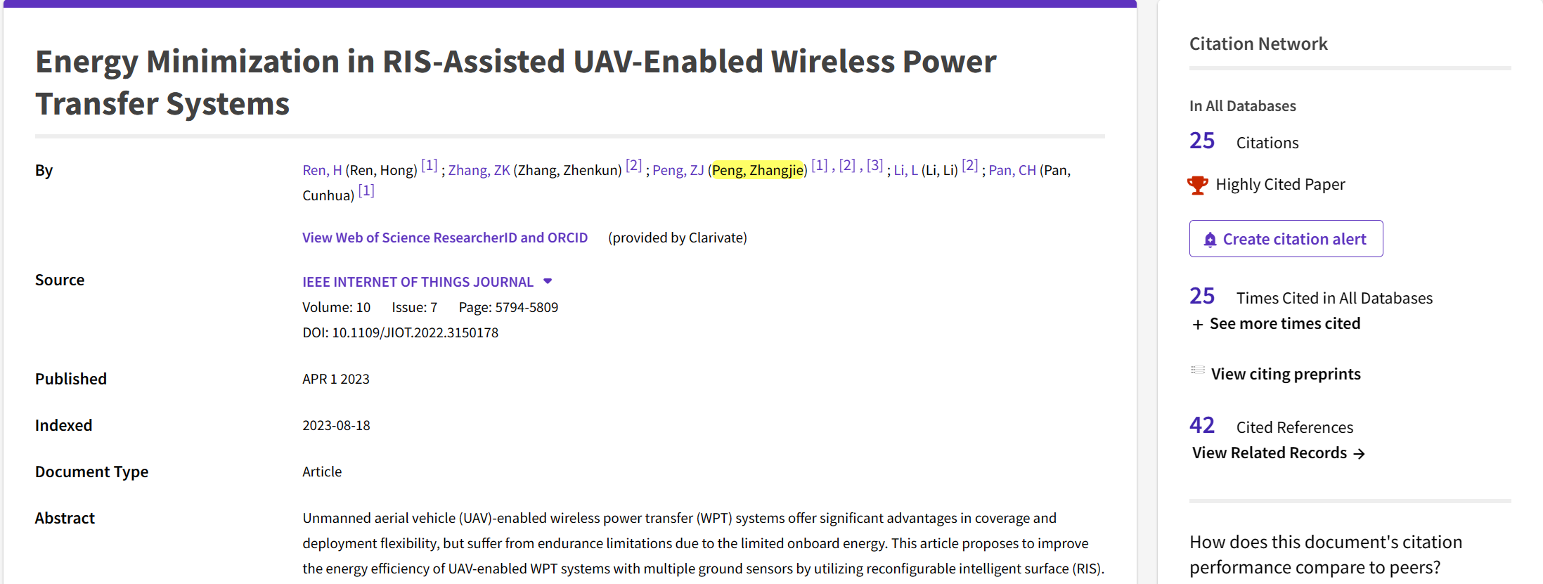 在6G方面,信機學院彭張節副教授作為通信作者在中科院一區期刊《IEEE Internet of Things Journal》上發表的論文“Energy Minimization in RIS-Assisted UAV-Enabled Wireless Power Transfer Systems”,被評為高被引論文(Highly Cited Paper)。