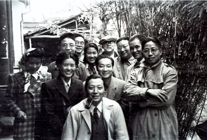 約1947年唐大郎和文藝界人士合影,第一排金山,二排左二、左三為馮亦代、鄭安娜夫婦,左四為丁聰,三排左一為唐大郎、左二為張瑞芳、左三為龔之方,四排左一為魏紹昌、左二為張俊祥